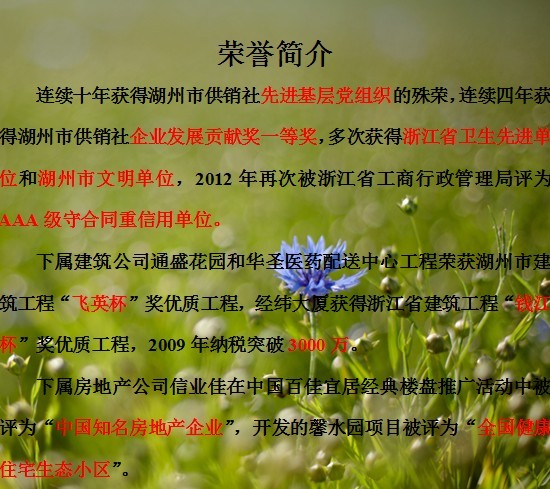 | 集團一直圍繞著“關(guān)注生命,關(guān)注環(huán)境”的產(chǎn)業(yè)布局方針,做強做大以房地產(chǎn)為龍頭,建筑、裝飾、新型材料、貿(mào)易、為輔助產(chǎn)業(yè)的建筑產(chǎn)業(yè)鏈;做精做活以制藥、化工為重要產(chǎn)業(yè)布局的新興產(chǎn)業(yè)鏈。公司連續(xù)多年被評為浙江省重合同守信用單位,連續(xù)13年被評為湖州市供銷社本級企業(yè)發(fā)展貢獻獎一等獎,并多次獲得浙江省優(yōu)秀民營企業(yè),全省供銷社50強企業(yè),供銷社系統(tǒng)先進基層黨組織等榮譽稱號。 |